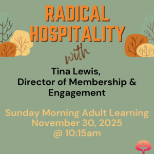 How can we continue to create a church where everyone feels deeply welcomed, seen, and valued? Join Tina Lewis, Director of Membership & Engagement, for an interactive session exploring what it means to live our DUUC mission of inclusion and compassion in everyday ways. Through stories and best practices, we’ll explore how each of us contributes to a culture of welcome from the parking lot to the sanctuary and beyond. Longtime members, newcomers, and friends are invited to participate. Together, we’ll learn how radical hospitality can transform not just our Sunday mornings, but our whole community.