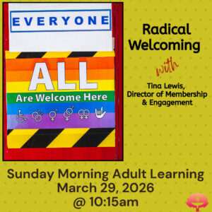 Everything we do at DUUC begins with relationships. From worship and religious education to justice work and governance, the quality of our connections shapes how we live into Shared Ministry together. Join us for an upcoming presentation on why radical welcoming is essential to our community. Every time someone walks through our doors, relationships begin again. How we greet one another — visitors, members, and friends alike — truly matters. Radical welcoming goes beyond politeness. It calls us to open our hearts wider, especially to those who may feel marginalized or unsure they belong. Come deepen your commitment to building a more inclusive, deeply connected DUUC.